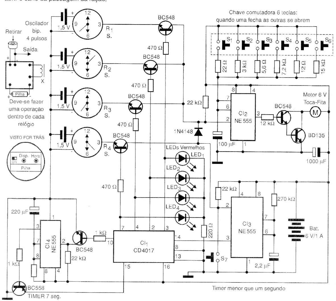 This circuit was found in a 2006 publication. It can serve as the basis for a microcontrolled version that would be simpler. You want to take a short trip and have no one to leave your dog with. The solution is an automatic feeder that works as follows: The clocks have a mechanism that unlocks when it arrives at the programmed time (activating the beep of 4 pulses in 1 second) after 40 minutes, it resets. Thus, the CI-1 has the function of turning these clocks on and off in sequence. The first three clocks R1, R2, and R3 send negative pulses to CI-2 and CI-3 (555). CI-2 is a timer that starts a motor whose purpose is to open the feed passage pipe, then close it. Through the return elastic the barrel is closed. CI-3 sends a negative pulse only to CI-3, triggering the output of pin 10 of CI-1. CI-4 has the function of resetting the circuit, initializing the process. Setting: 1) The current time on all watches.