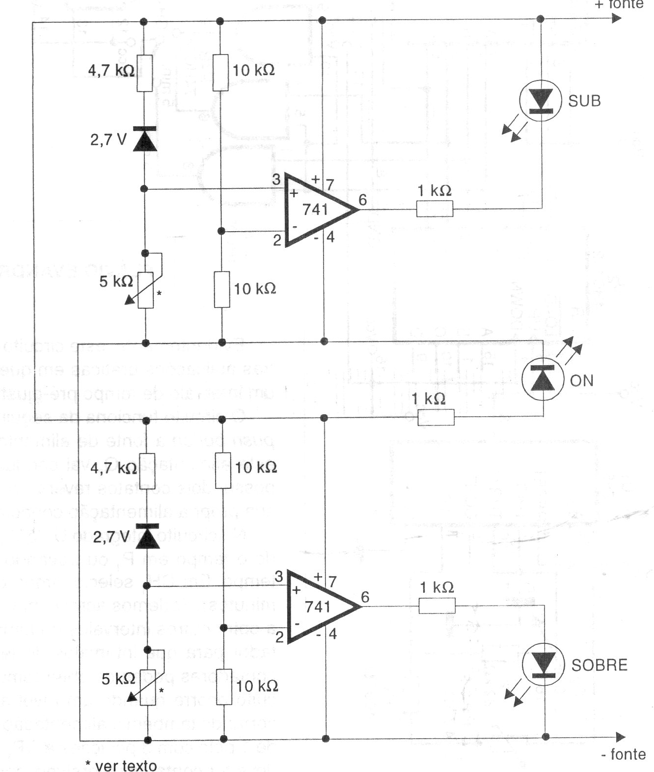 This is a traditional comparator configuration to obtain an under and over voltage indicator. In this case, the comparators are configured with operational 741 and the trigger points are adjusted in trimpots that can be 4k7 or even 10k.