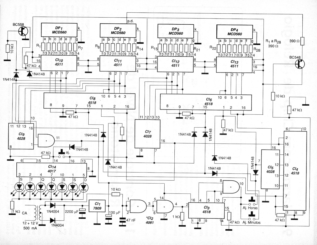 This traditional clock circuit with common CMOS components with discrete logic functions was found in a 2003 documentation. The clock is obtained from the power grid itself, which guarantees excellent operating accuracy. The circuit uses common cathode displays for hours and minutes.