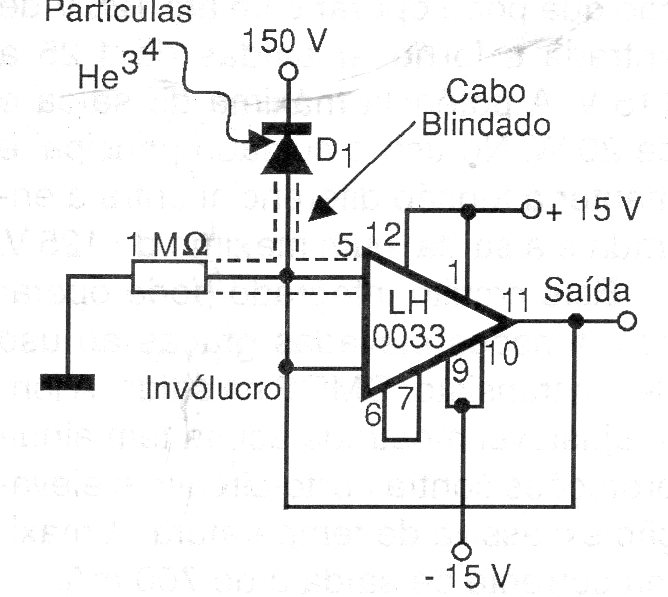 This circuit makes use of an unusual component which is a large surface diode that can be used to detect particles. A pulse is emitted when a particle is detected. The operational amplifier used admits equivalents of lower supply voltage. The power supply must be symmetrical.