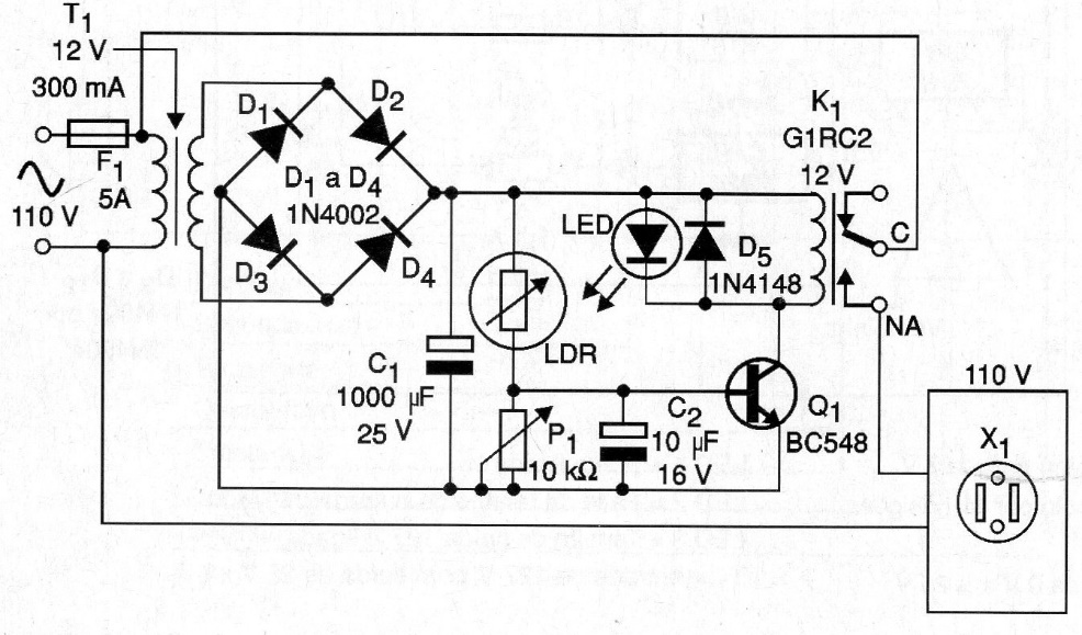 The idea of this 2002 circuit is to turn on a coffee maker automatically at dawn. The sensor is an LDR that must have the actuation point set to P1. The LDR should be in a tube pointing to the sky to detect the light of dawn and not the light of local illumination. The relay must be live according to the coffee maker.