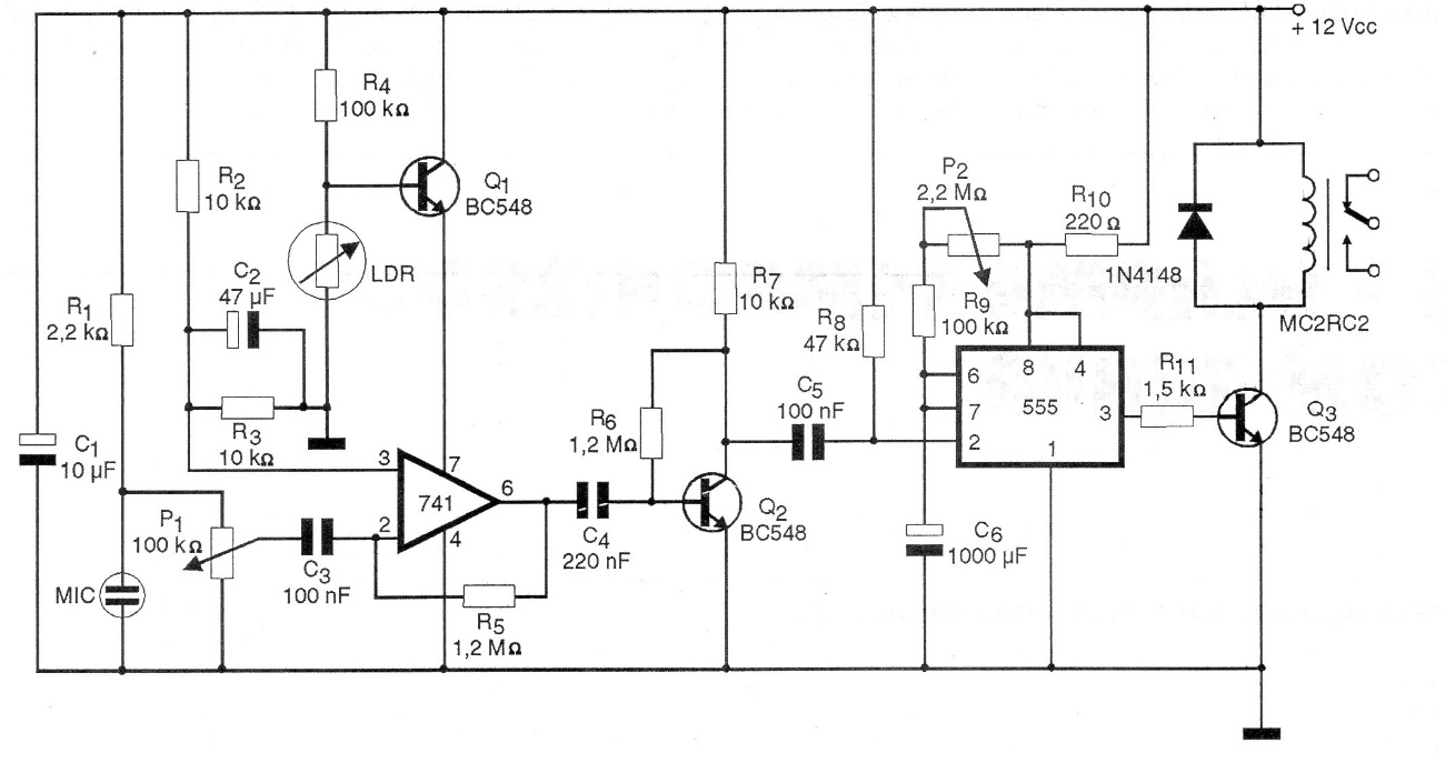 This circuit is intended for monitoring an environment. It fires a relay with a sound, but only if the place is dark. The circuit is supplied with 12 V according to the relay, and the trigger point adjustment is made in the input trimpot. The timing is adjusted in the trimpot next to 555. The circuit is from 1997 documentation.
