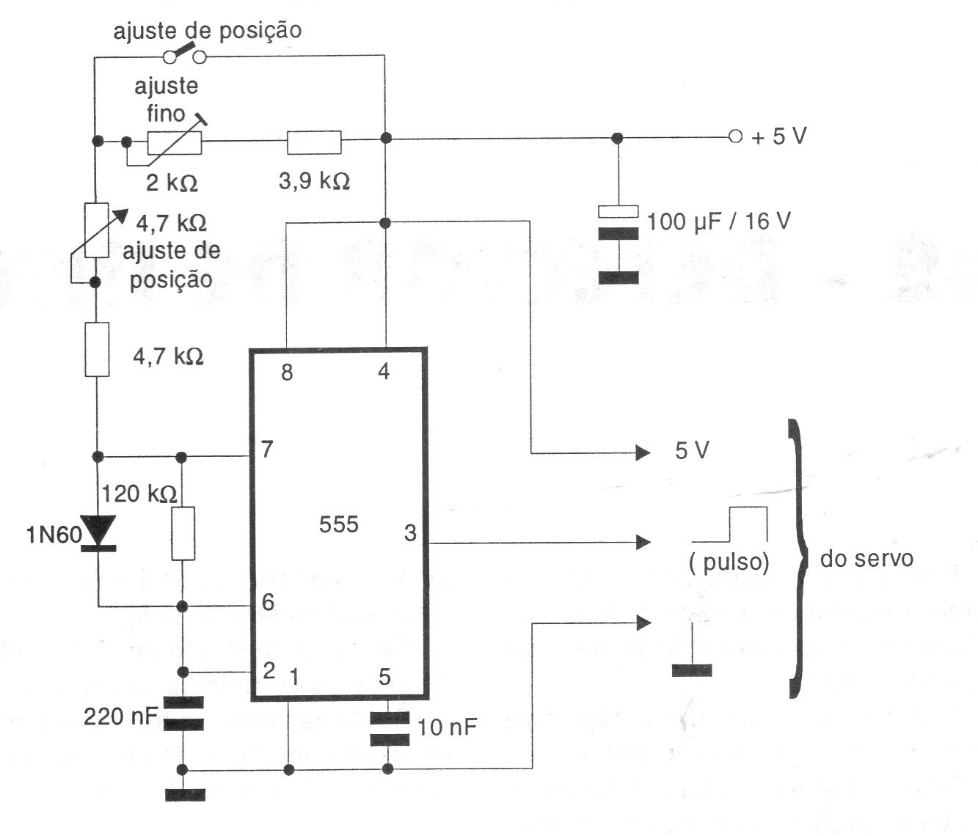 This simple circuit allows you to control remote control servos that operate with pulses. The circuit is powered by 5 V and has a central position adjustment of the servo.