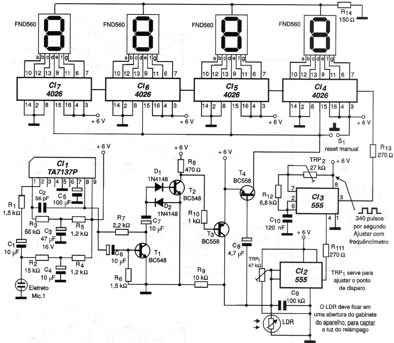 Considering that the speed of light is extremely great which makes us see a lightning flash instantly and the speed of sound is much less, marking the time between the instant of the radio and the instant the sound of thunder arrives we can know how far the event occurred. This is the purpose of this circuit, a digital indicator that already considers the speed of sound of approximately 340 m / s and that provides the indication in meters on a 4-digit display. To detect lightning the circuit uses an LDR and to detect thunder an electret microphone. CI1 is not a common component today but can be replaced by a common one. The double T causes the microphone to detect only the low frequency of thunder.