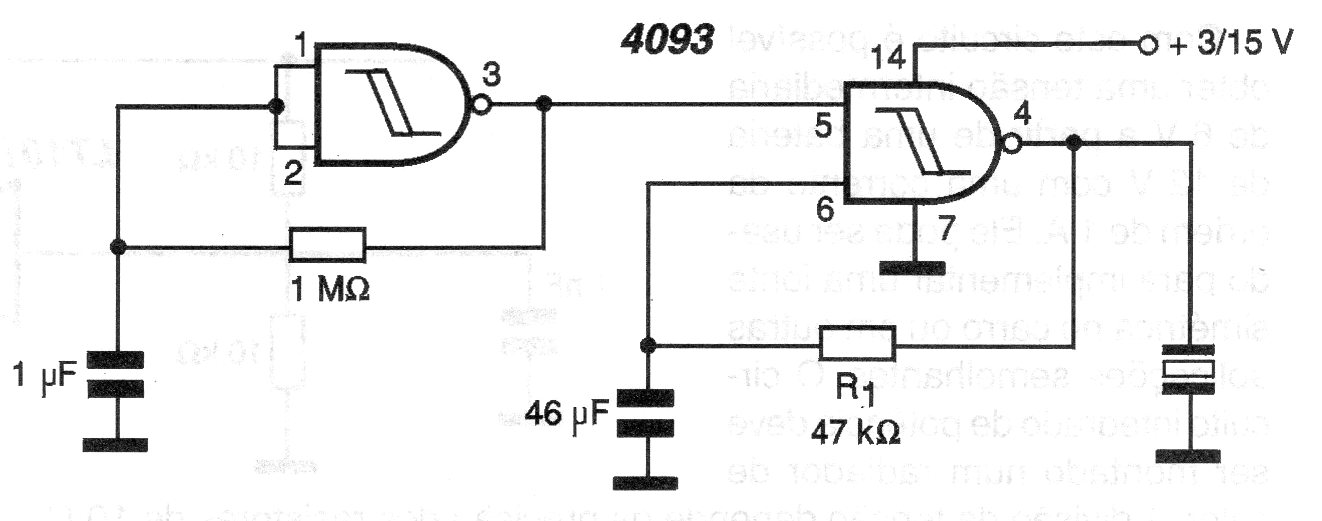 This circuit produces an intermittent sound in a ceramic piezoelectric transducer, for example, a simple capsule that does not have an oscillator. Capacitors can be changed to modify the sound. The circuit works with voltages from 3 to 15 V. The capacitor indicated in the original 2001 circuit as 46 uF, in fact, is 47 nF.