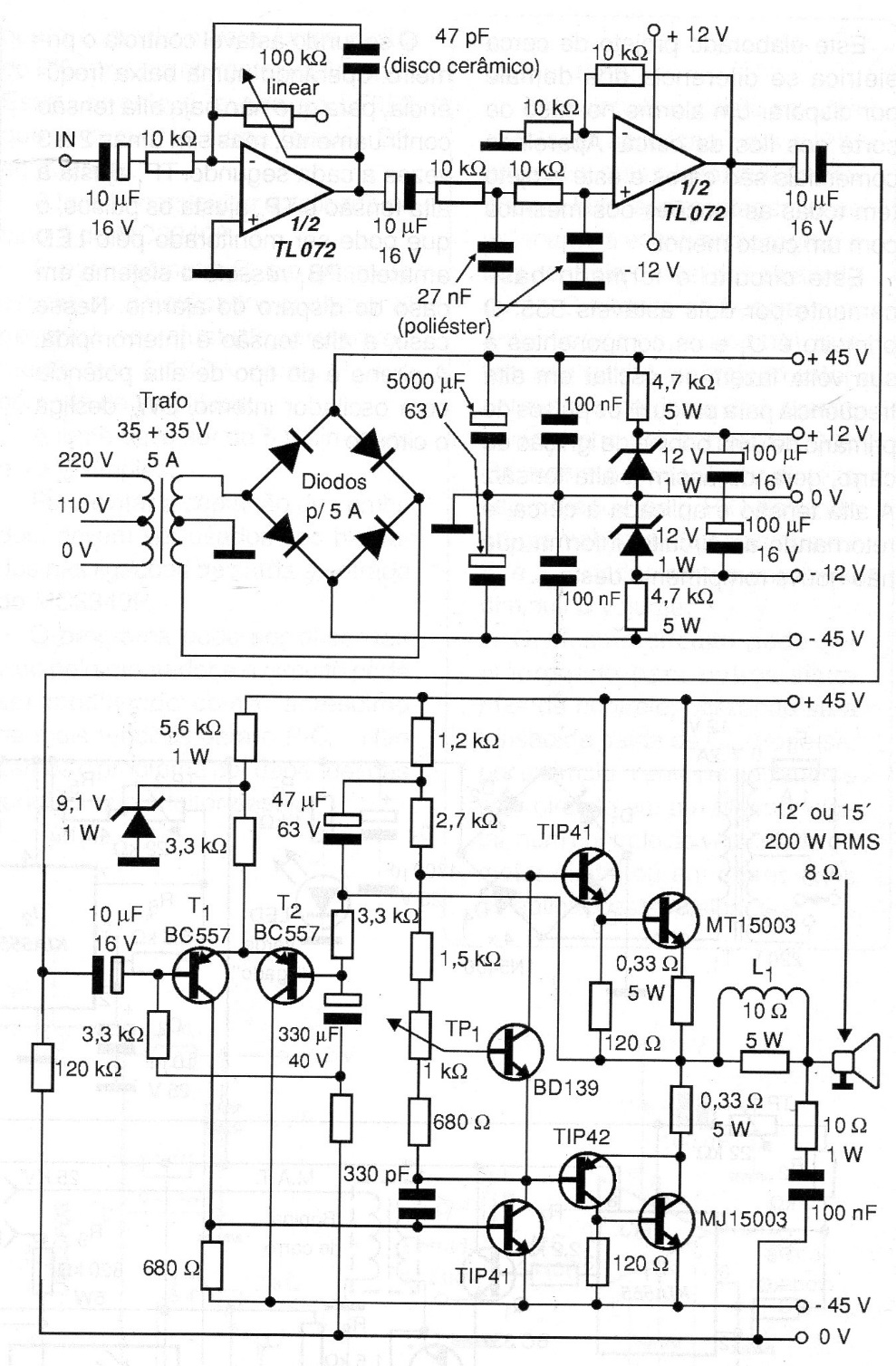 The circuit presented is quite interesting due to the low-pass filter using the integrated circuit TL072 (Double Operational Amplifier). However, the power amplifier with common transistors can easily be replaced by more efficient and more modern configurations. Among them, we highlight the LM3886 integrated circuit that we have already described in articles in this magazine, which consists of a 60 W integrated amplifier that in the bridge configuration can provide 240 W and that would be ideal for this type of application