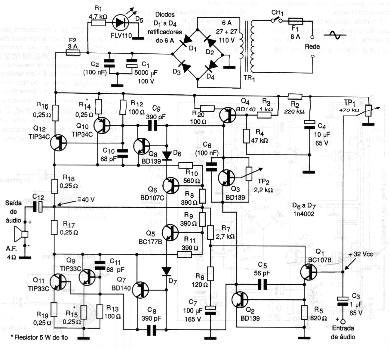 This high-power amplifier was found in 2001 documentation. The output transistors must be equipped with excellent heat sinks. The high current tracks on the printed circuit board must be wide. TP2 and TP1 must be adjusted to the lowest resting current that results in distortion-free reproduction.