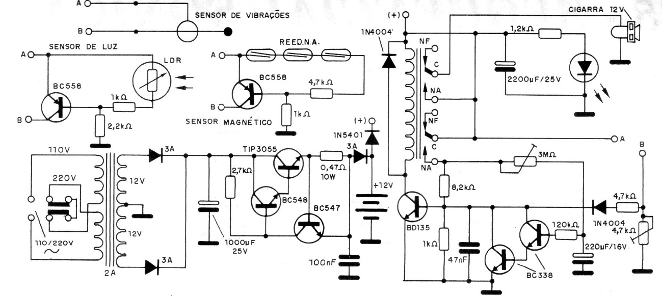 We found this circuit with several types of sensors in a 1995 documentation. The circuit also has a system that keeps a battery in recharge that is in operation if the power is cut; All the components used in this project can still be found easily.