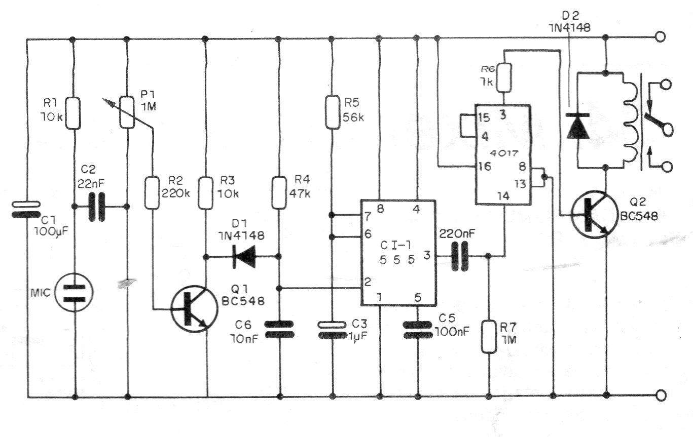 This sound relay, Vox or acoustic switch has a bistable action triggering a relay when the microphone picks up any sound. The circuit can be powered by 6 or 12 V depending on the relay used and the sensitivity is adjusted in a trimpot or potentiometer (P1).