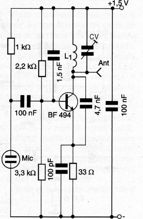 The coil of this small FM transmitter that works as a wireless microphone consists of 4 turns of 24 or 26 AWG wire in the form of 1 cm without core. The circuit is from 2005 documentation and uses a two-terminal electret microphone. The power can be done with one or two AAA batteries.