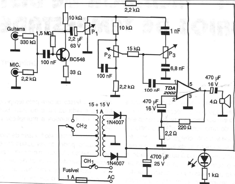 This circuit provides good audio power to a box that contains a heavy speaker of at least 8 inches. The circuit includes the power supply, and the integrated circuit must be mounted on a good heat sink. The box contains inputs for a microphone and a pickup for musical instruments with included preamp.