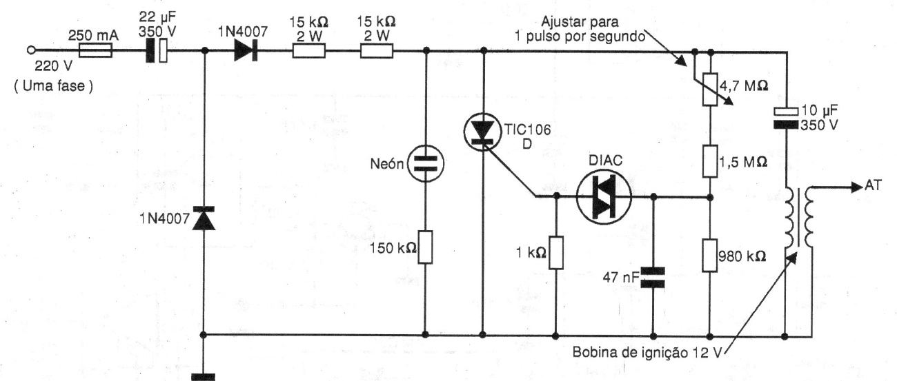 This circuit uses an ignition coil to generate the high voltage that electrifies a fence. However, in the 1999 original there is no provision for isolating the power grid, which is mandatory. This can be done through an isolation transformer or using a separate ground flyback to generate the high voltage.