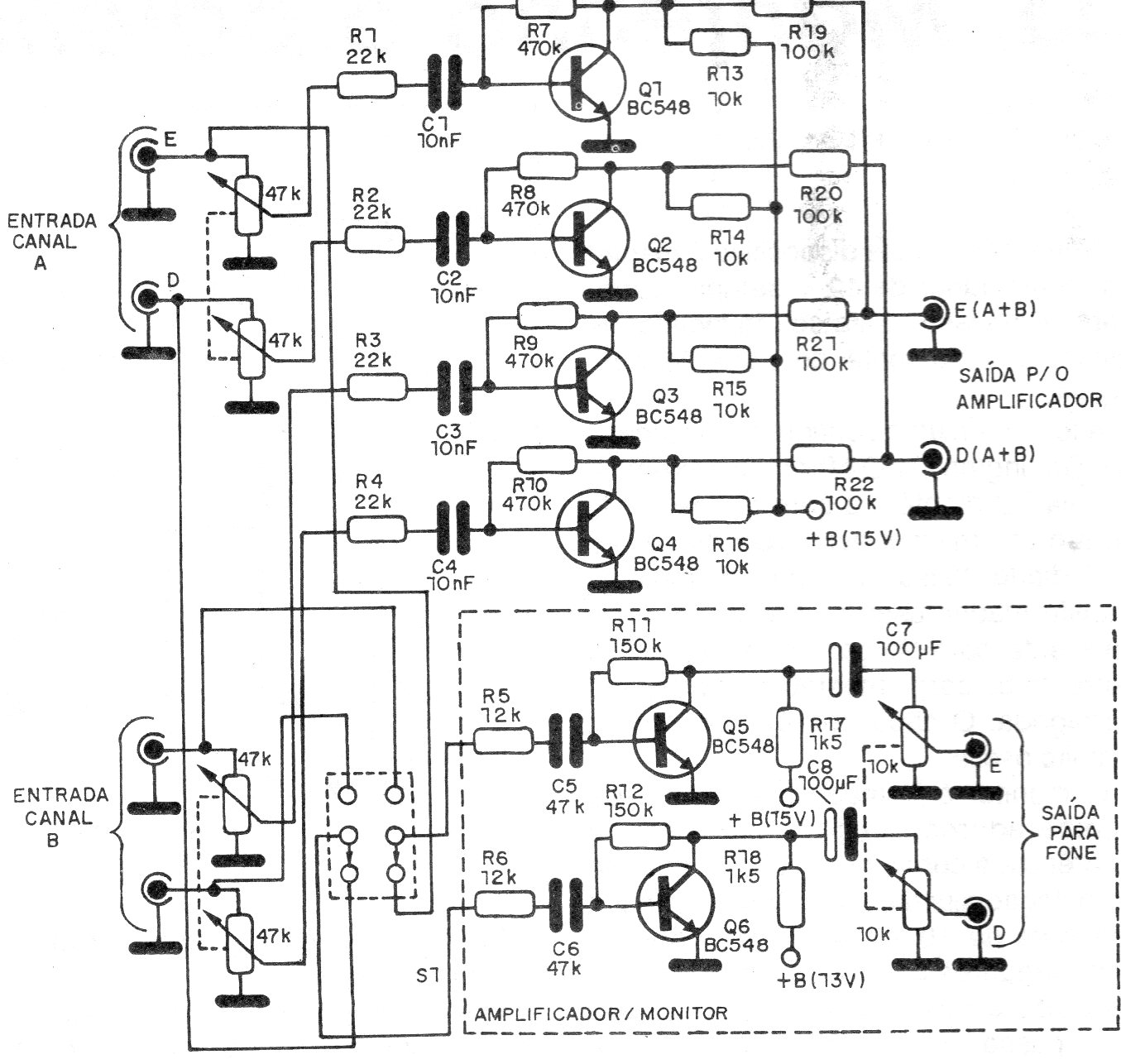 This circuit with traditional discrete components was found in a 1990 documentation. The circuit can be powered by 6 or 12 V from a source or batteries. Input and output cables must be shielded, and headphone output is included.