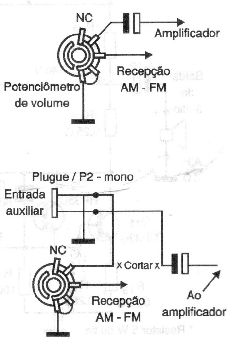 In the figure we show how to use an old portable AM or FM radio as a test amplifier or signal follower. A test input is added, being connected to the volume control potentiometer.