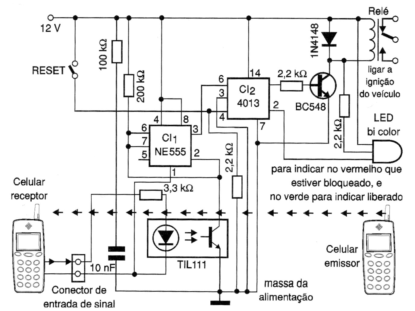The circuit presented was developed to turn off the ignition of any vehicle by ringing a cell phone or landline, to avoid theft, making it possible to turn off the engine in a real theft situation. The device can be installed in any motor vehicle including motorcycles, passenger cars, etc. In the case of trucks, it is especially interesting because it avoids even theft of cargo. The system must be connected to a cell phone at the call signal output for it to work remotely. Whenever a call is made to this cell phone number, the ignition will be turned off. To turn on, there is a SET button (01) which, when pressed, will allow the vehicle to operate normally.(2006)