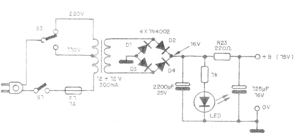 This simple, unregulated power supply is indicated for non-critical projects that require currents up to 300 mA or slightly more if the transformer is changed. Resistor R23 must be at least 1 W. The circuit is indicated for supplying the Mixer of the CB17357E.