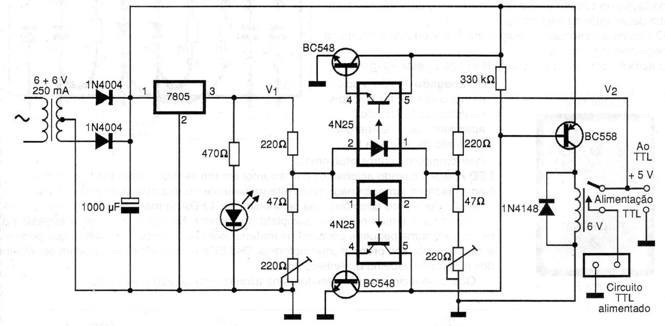 The purpose of this circuit is to prevent TTL circuits from receiving a voltage greater than 5 V when in operation. The circuit uses a comparator that triggers the relay when the voltage exceeds 5 V. The adjustment is made in two trimpots.