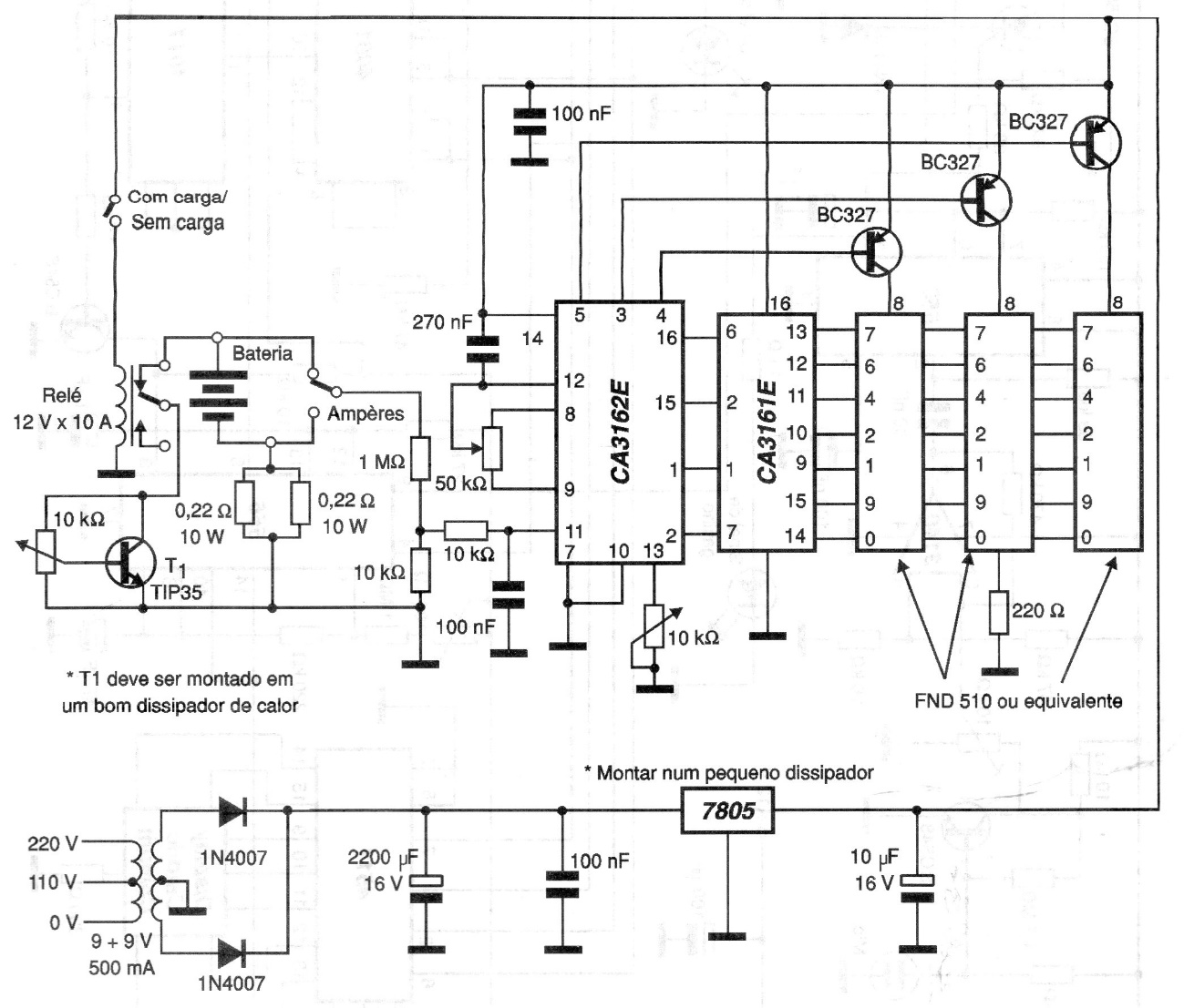 The 3-digit AD converter on this circuit is not very common today. It uses 2 integrated circuits to supply 3 displays, but the circuit can be designed with other, more modern converters. It measures the voltage of a battery and the current. The voltage regulating circuit must be equipped with a heat sink.