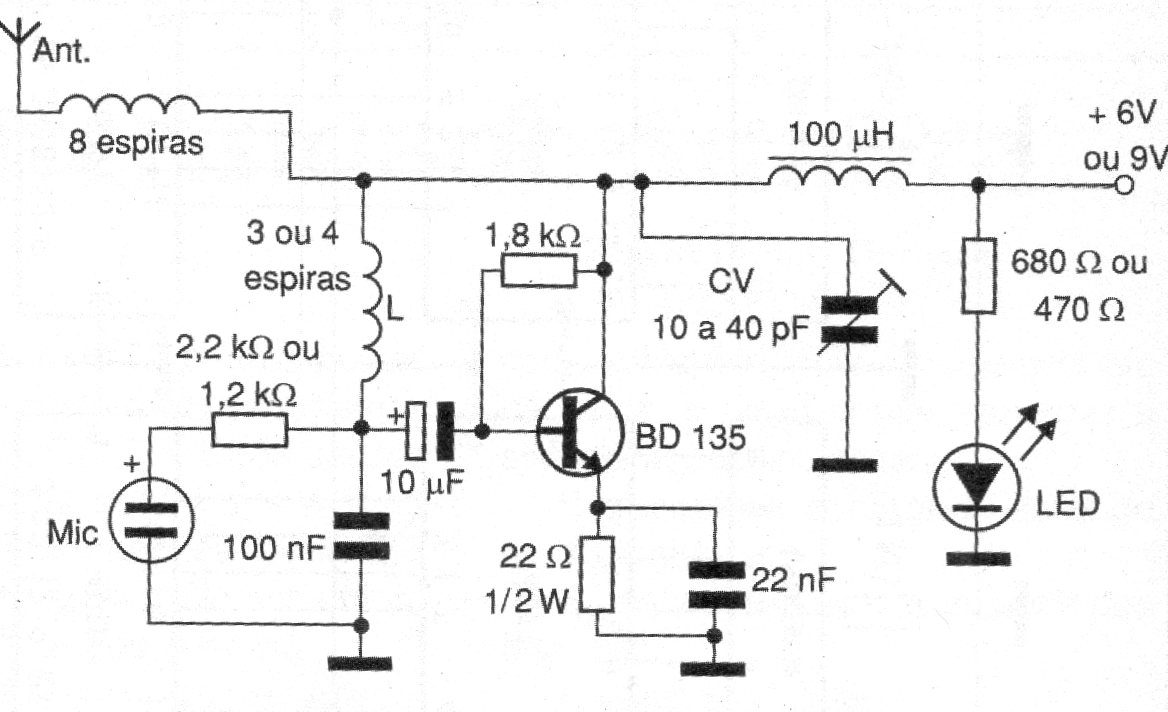 Although the BD135 transistor is not specifically for RF applications, some of them can easily oscillate at frequencies that exceed 100 MHz. An example of this is this circuit that can provide good power in the FM band. The RF shock consists of 80 to 100 turns of 32 AWG wire (or thinner) in a 4 to 5 cm long and 1/2 cm diameter ferrite rod. This shock can also be found ready in the specialized trade. The coils are wound with 22 AWG wire with 1/2 cm in diameter without core. L1 (antenna) is formed by 8 turns and L2 (oscillator) by 3 to 4 turns.