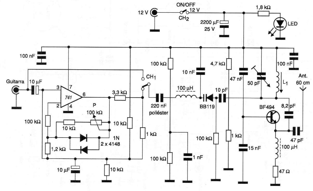 In addition to transmitting the signals from a guitar to an FM receiver, which can be connected to an amplifier, this circuit distorts the signal with a special sound effect. L1 consists of 4 turns of wire 22 to 26 in the form of 1 cm without core. Be careful with the signal trails to be taken so that no noise occurs.