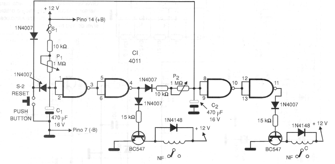 We found this timer circuit in a 1999 documentation. It triggers two relays sequentially, at programmed times. The times depend on the capacitors and the adjustment of the potentiometers. Capacitor values can be increased for longer times. The supply is 12 V, depending on the voltage of the relays.