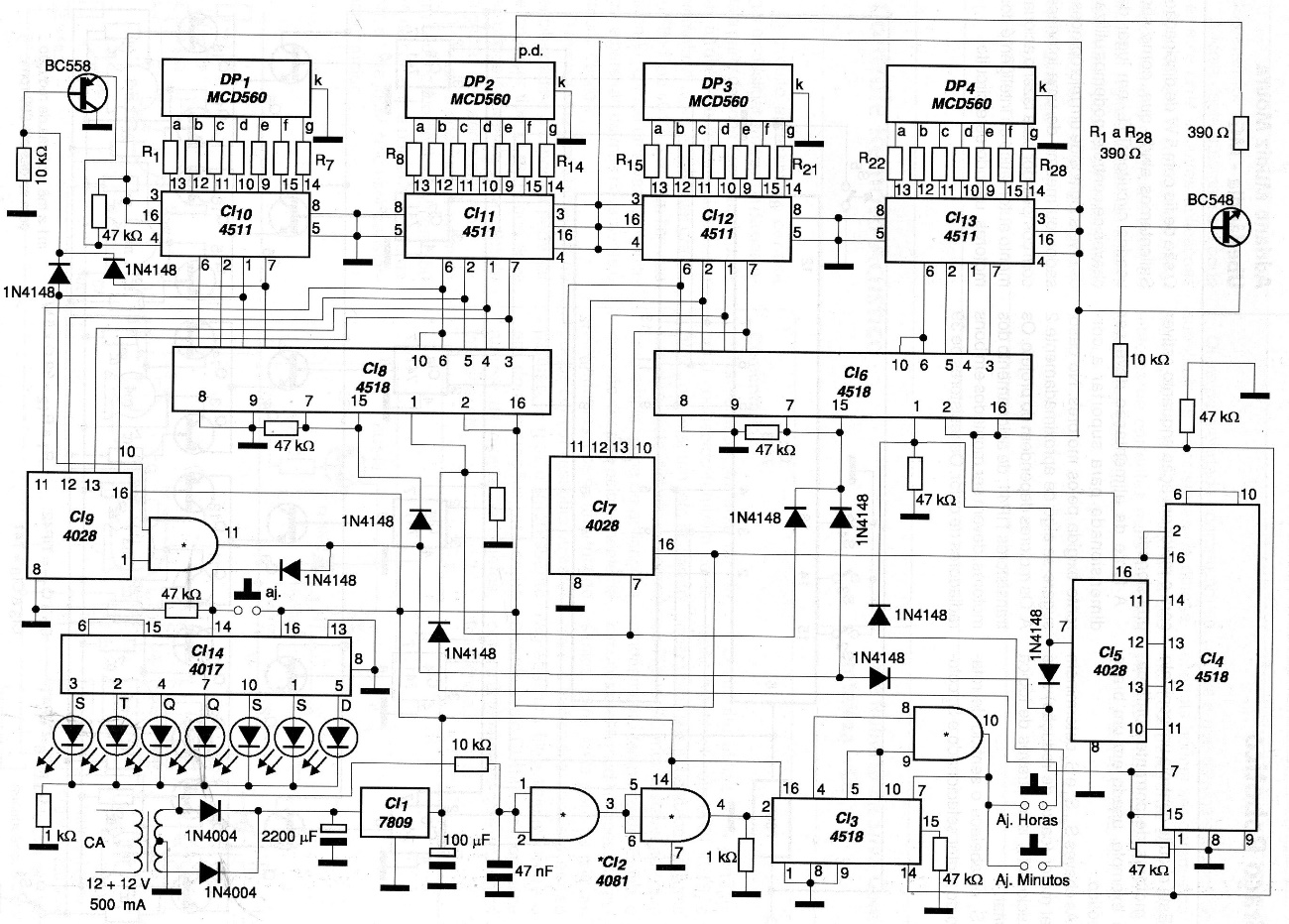 This is a type of project that is highly requested as work in technical and engineering courses for the discipline of Digital Electronics. In it, you can apply several basic concepts such as division by n, counting pulses, the operation of decoders and displays and clock circuits. The circuit shown is classic, except for some features added by the author. However, the basis remains, which can be changed, according to the needs of the readers. An important point to note in this type of project is that clocks synchronized by the network pulses tend to advance in noisy networks as they count as additional transient pulses. So, if this occurs in your project, we recommend increasing the value of the 47 uF capacitor connected to pin 2 of CI-2 to do its filtering.