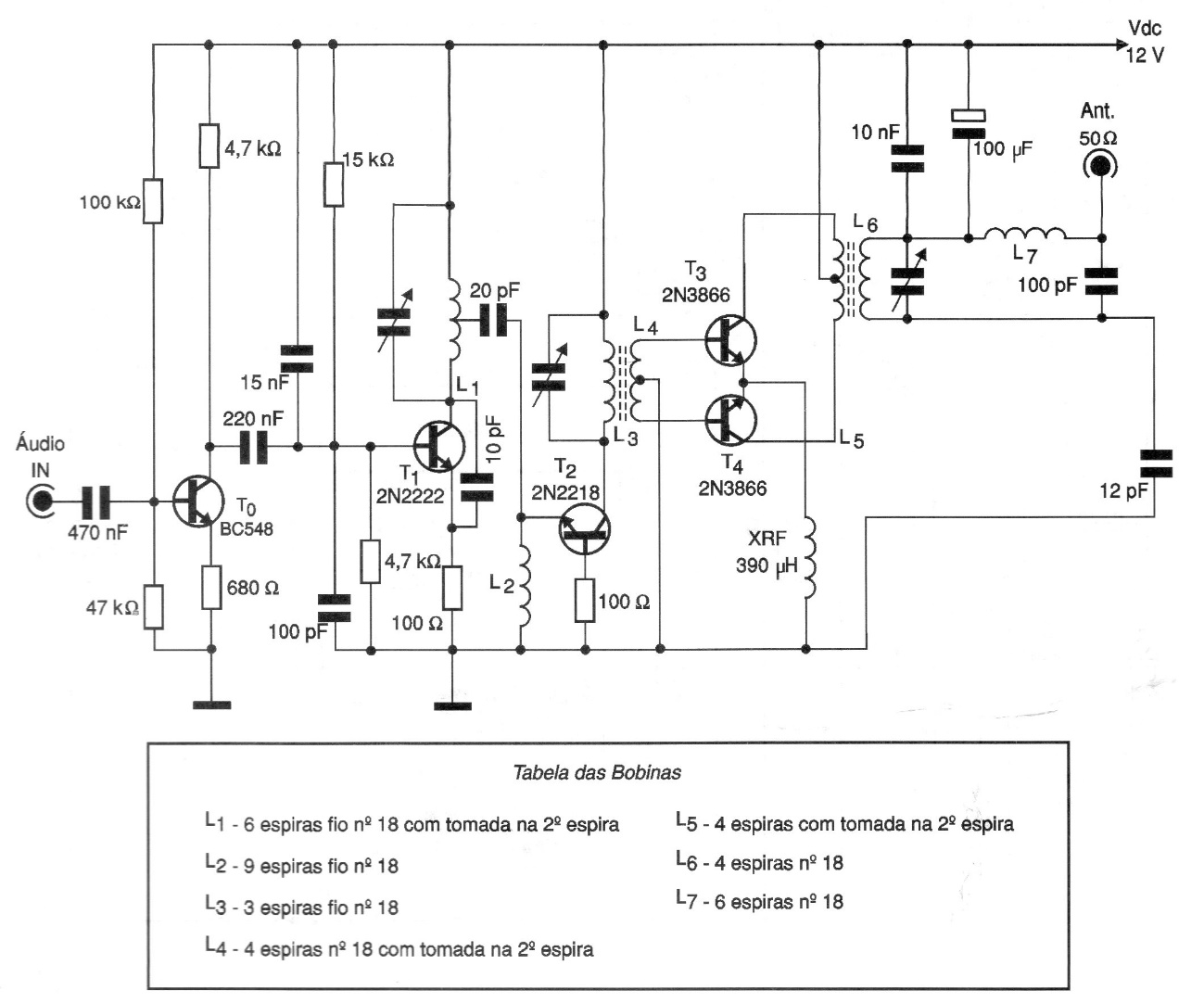 This powerful FM transmitter was found in a 2002 documentation. The output transistors must be equipped with heat sinks and the source with at least 1 A must have excellent filtering so that there is no noise in the transmission. The table next to the diagram provides information for coils that must be 1 cm in diameter without a core.