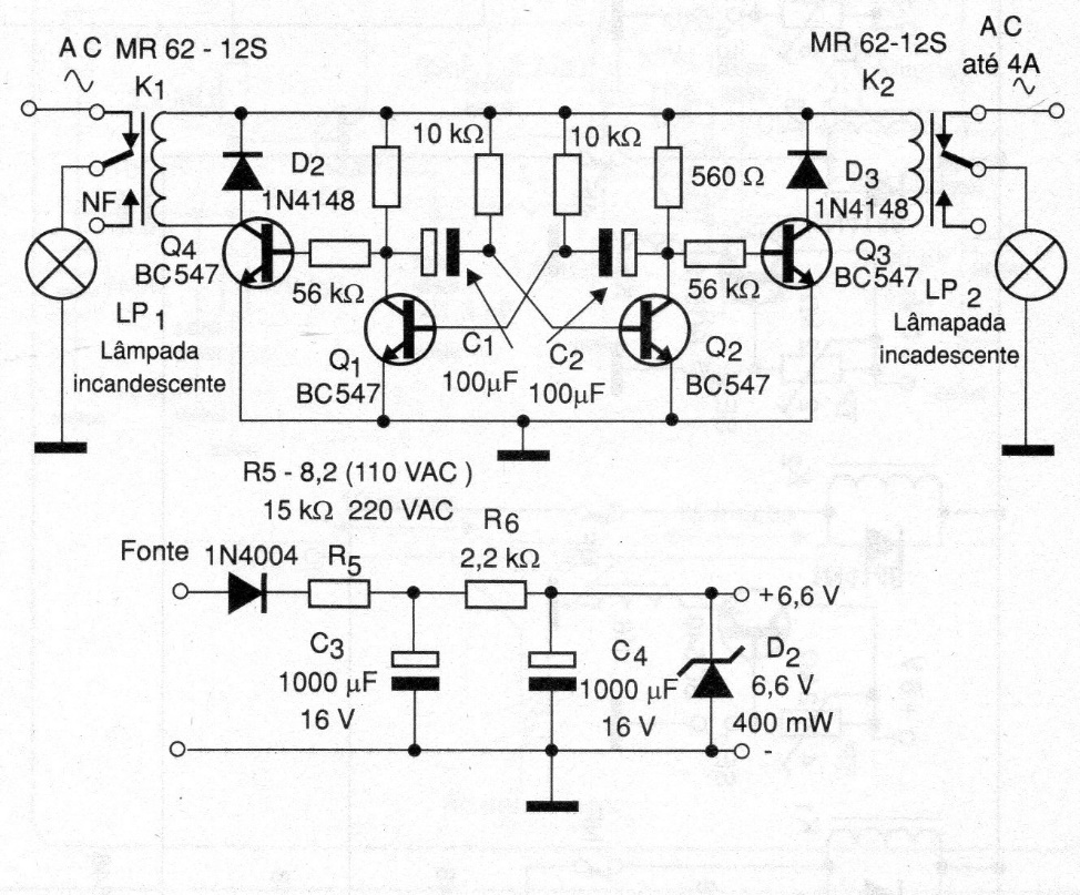 This common circuit using a multivibrator causes two lamps to alternately flash at a frequency and active cycle determined by the capacitors. The circuit is powered by 6 V which is the voltage of the relays used.