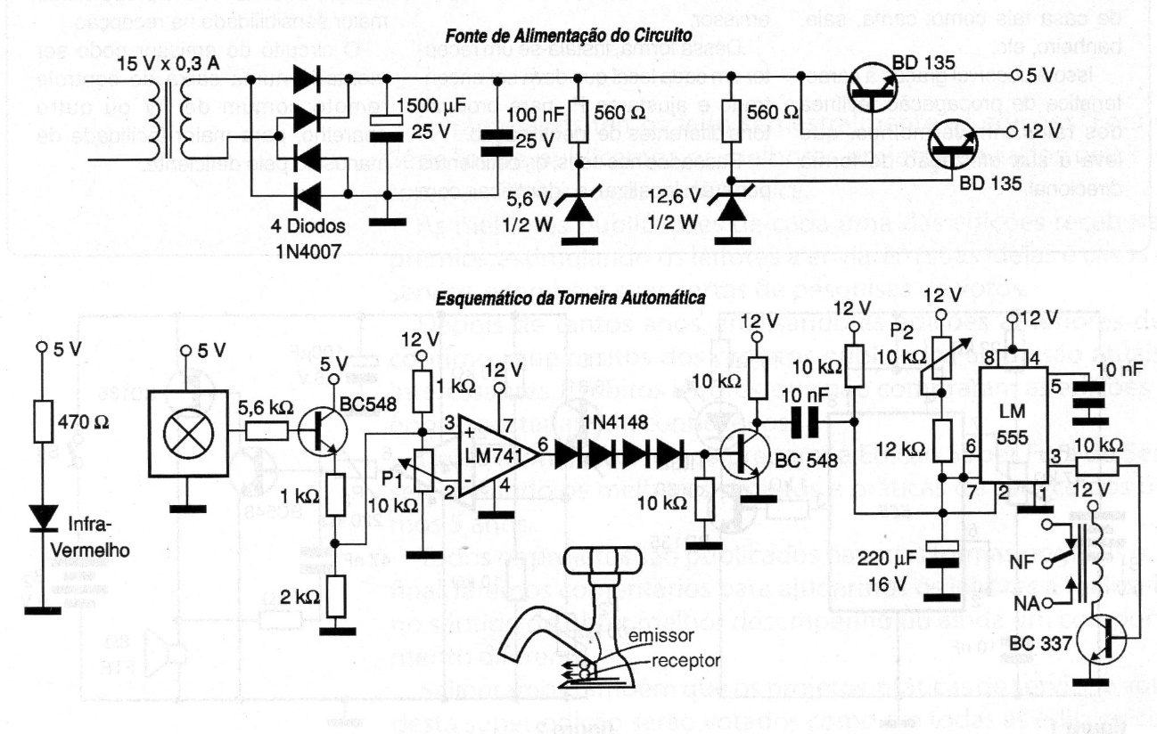 This is a very interesting automation that can be adapted for other types of applications. In fact, the sensor can be used to detect the passage of objects on a conveyor and activate an automatic washing system or another type of actuator, depending on the application. The way in which the various elements of this circuit were used can serve as a basis for many other projects. We observed that the sensor is of any type of three terminals, normally found in remote control systems. Another point of improvement in the project is the exchange of discrete regulators for regulators 7805 and 7812 in the power supply.