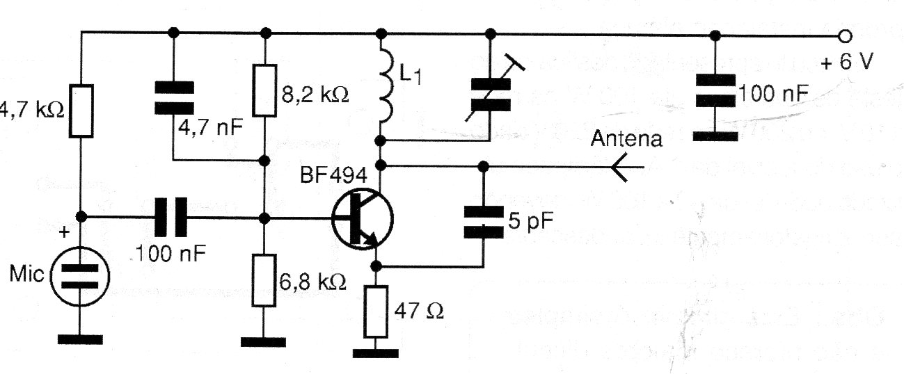 The transmitter shown can reach around 100 meters depending on the location and sensitivity of the receiver. It also influences the existence of many stations on the site and sources of interference. The circuit can be powered by 4 small batteries and function as a good steering microphone. The antenna is of the telescopic type or a 15 to 40 cm piece of rigid wire. All capacitors must be ceramic, and the coil consists of 4 turns of 20 AWG with 1 cm in diameter without core. In the 2-20 pF trimmer, the operating frequency of this transmitter is adjusted.