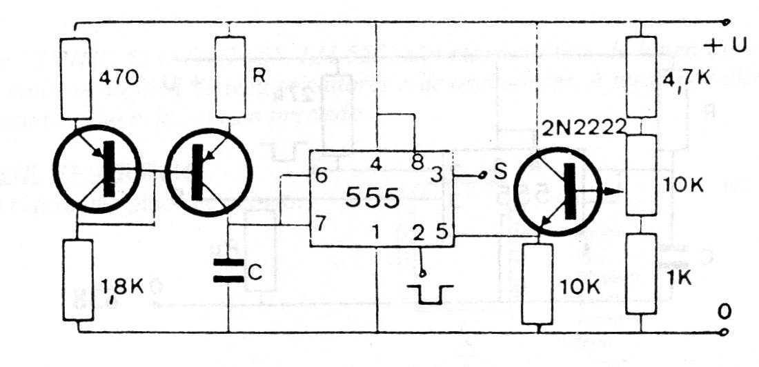 This circuit is a variation of the previous one (CIR10372) with a feature that allows the constant charge of the capacitor. In this way, the voltage in C rises linearly during the charging process in monostable operation. Power voltage can be between 5 and 15 V.