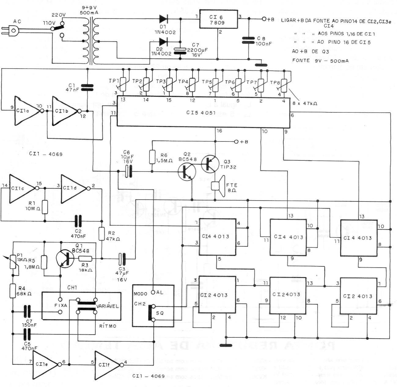 This circuit is from a 1995 documentation. Several CMOS integrated circuits are used to produce different sound effects. The circuit has its own amplifier, but C6 can be used to send the signal to the input of a powerful amplifier or mixer.
