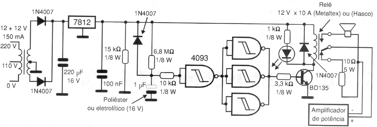 This circuit, found in a 1999 documentation, prevents the speaker from being connected as soon as the amplifier is turned on, thus avoiding current spikes that could damage it. The delay is given by the 1 uF capacitor. The relay must have contacts according to the peak current of the amplifier, normally in the order of 10 A.
