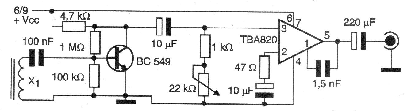 We describe a simple wiretapping system that does not require any connection to the line. To operate the system, simply bring the pickup coil X1 close to the line, thus capturing the signals. This coil is the so-called “maricota” used by radio amateurs to connect the line to transmitters. It can also be obtained from old phones and alarm clocks. In the circuit, the coil excites a pre-amplifier transistor that powers an audio amplifier of the type TBA820.