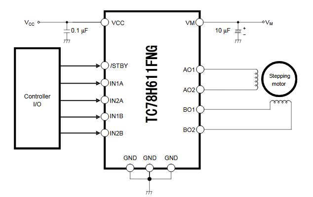 The circuit shown is from the component's datasheet, allowing the control of stepper motors up to 1.1 A. The integrated circuit is from Toshiba and for its supply the voltage Vcc and 5 V. For the motor, the maximum voltage is 18 V. The circuit is from Toshiba.