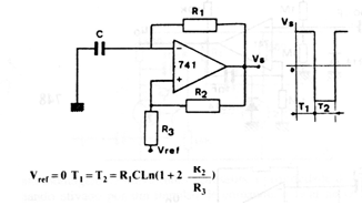 This circuit that generates rectangular signals, can also be implemented with other operational ones. The formula for calculating the components is given next to the diagram.