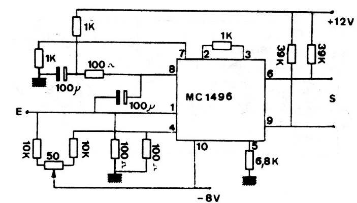 Motorola's MC1456 integrated circuit used in this application is not very common today. The configuration doubles the frequency of a signal and must be supplied with a symmetrical source of -6 and 12 V.