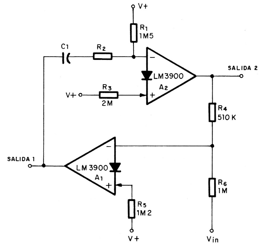 This circuit consists of a monostable multivibrator using the LM3900 transconductance operational amplifier. The circuit is from an old documentation about operations and the time constant is given by C1 and R2.