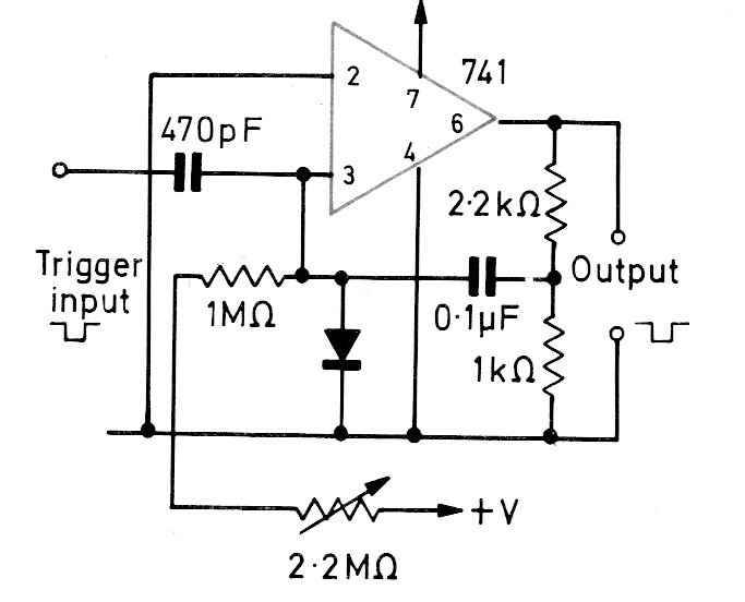 This basic operating configuration applies to types other than 741. The circuit does not require a symmetrical source and the time the output remains at the high level depends on the capacitor. The circuit was found in an old European documentation. The positive supply can be made with voltages from 6 to 12 V.