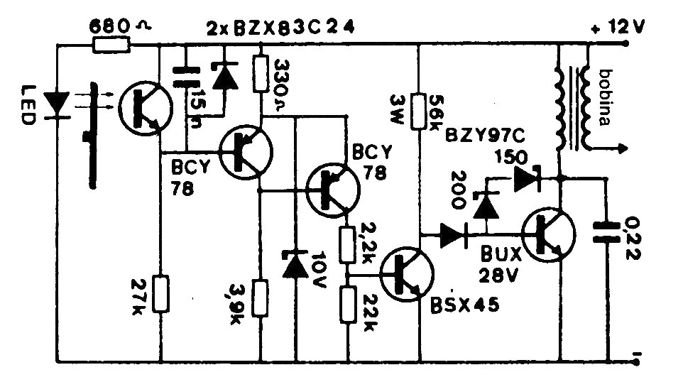 This circuit was found in documentation from the 1980s. The control pulses are obtained by an optical system with an emitting LED and a phototransistor. The components used admit modern equivalents.