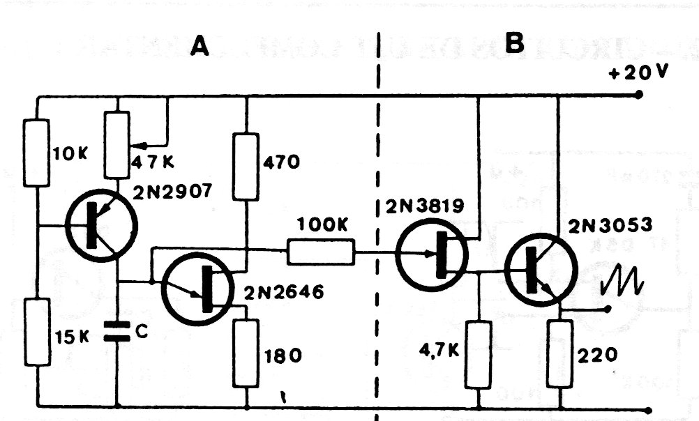 This circuit uses bipolar transistors and unijunction transistors to generate a linear ramp in frequency that depends on capacitor C and the potentiometer setting. The circuit operates up to a few tens of kilohertz and has a FET that can be the BF245.