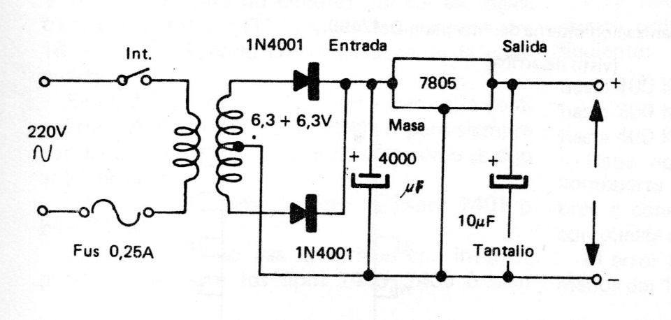This power source is indicated for the supply of the previous circuit (CB19638E), but it is also used for other TTL assemblies or that use 5 V microcontrollers. The circuit is from an old documentation and the voltage regulator must be equipped with a heat sink.