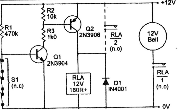 Using two transistors, the resting current for this alarm is 25uA. The circuit was found in an American documentation from the 90s. The transistor Q1 can be BC548 and Q2 the BC558, and relays of 6 or 12 V can be used, depending on the supply voltage. The circuit is not locked.