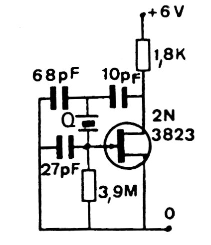 This configuration reaches a few tens of megahertz depending on the crystal and the FET. Capacitors must be ceramic. The FET admits equivalents.