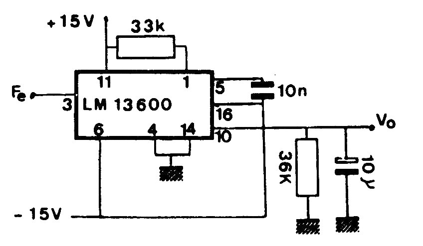 Motorola's LM13600 integrated circuit is not very common today. The input voltage is 10 mV. We found this circuit in an 80's documentation. The voltage output is proportional to the frequency of the input pulses.