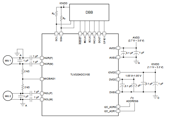 In the figure we have an application circuit for the stereo to digital analog sound converter using the Texas Instruments TLV320ADC3100. The circuit was obtained from the component's own datasheet. The supply is made by two voltages which are indicated in the diagram and the consumption is very low.