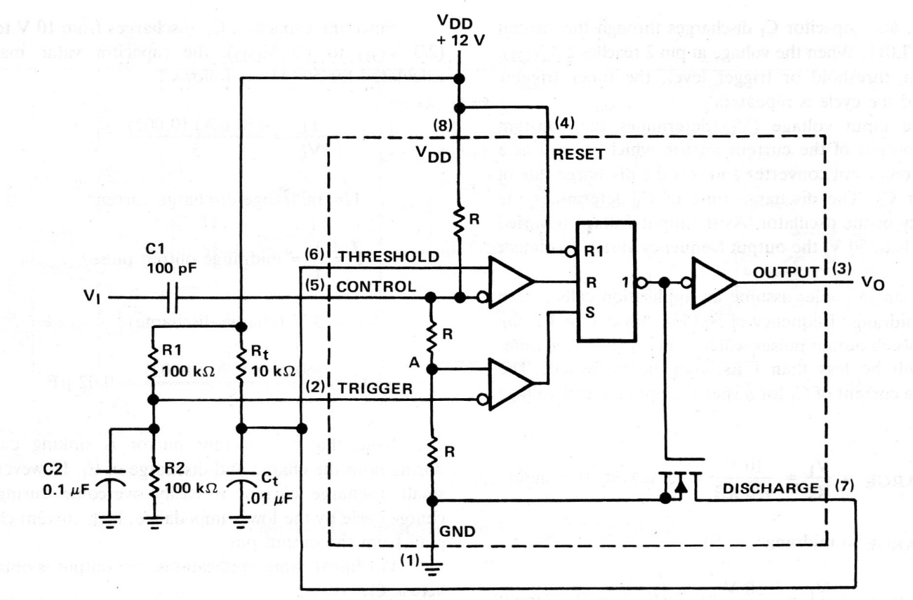 This conventional application of the 555 as monostable was found in a technical documentation from Texas Instruments of 1996. The circuit can be supplied with voltages from 5 to 15 V. With changes in the output, it can be used as a shield and on the website full information about the calculation of the components used.