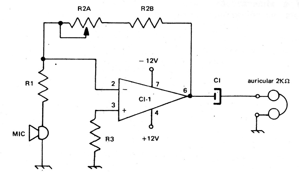 The operational of this amplifier can be the 741 and the resistors R1 and R3 are of 10 k. R2B is also 10k and the potentiometer is 1 M. The capacitor is 100 uF and the supply must be symmetrical from 6 to 12 V. The circuit is from a 70's manual.