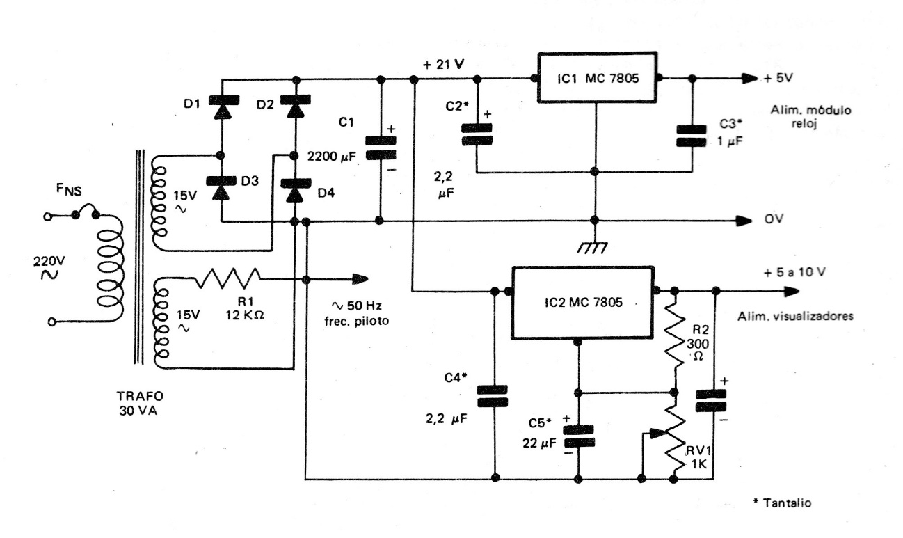 This is the power source suggested in the old European publication for the CB19635E watch. The circuit provides two voltages. One of the regulators is still common, but the other must be replaced with an equivalent according to voltage. Note that the circuit is for the 50 Hz power grid and modifications must be made to the clock circuit if it is to work on the 60 Hz power grid.