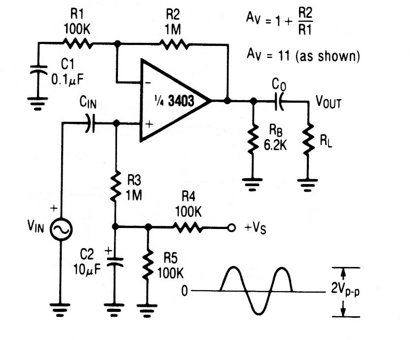 This well-crafted configuration makes use of the 3403, an operational amplifier from Raytheon that is uncommon today. However, a similar circuit can be designed based on modern operational equivalents. The power supply must be symmetrical.